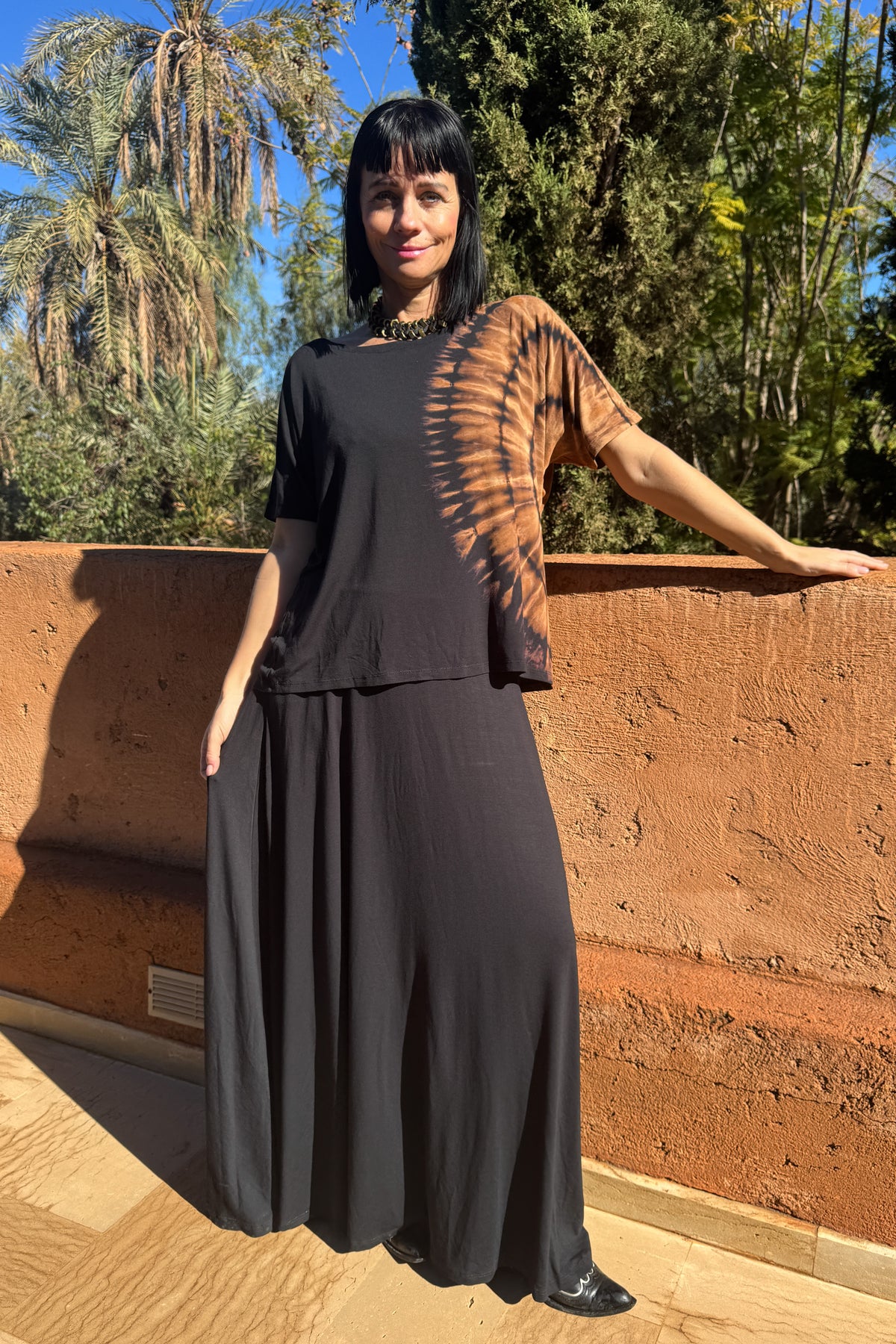 Vores Sorte lange nederdel er lavet af blød viskose. Den brede elastik i taljen giver en fleksibel pasform, mens de praktiske sidelommer tilføjer et afslappet touch. Ideel som cozy wear til afslappede dage eller som et elegant touch til din garderobe.